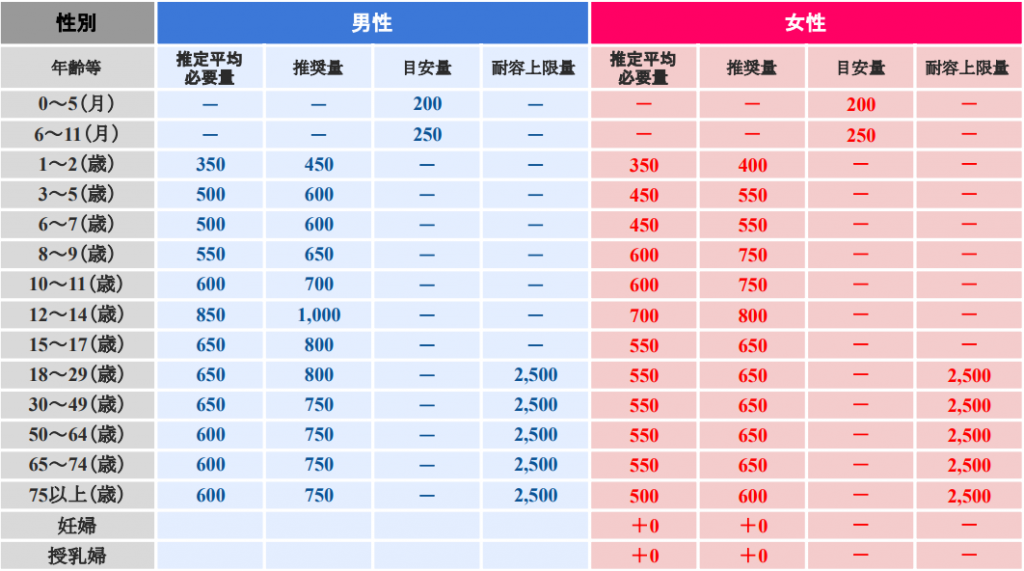 年齢別・性別のカルシウム目安摂取量一覧